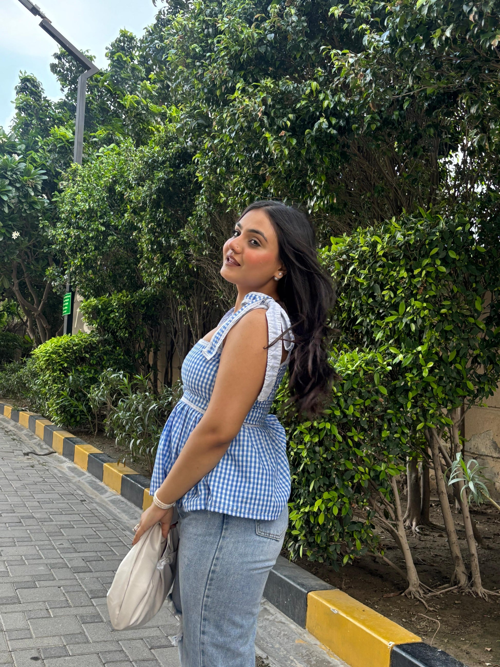 Blue gingham top withe lace and tie up detailing